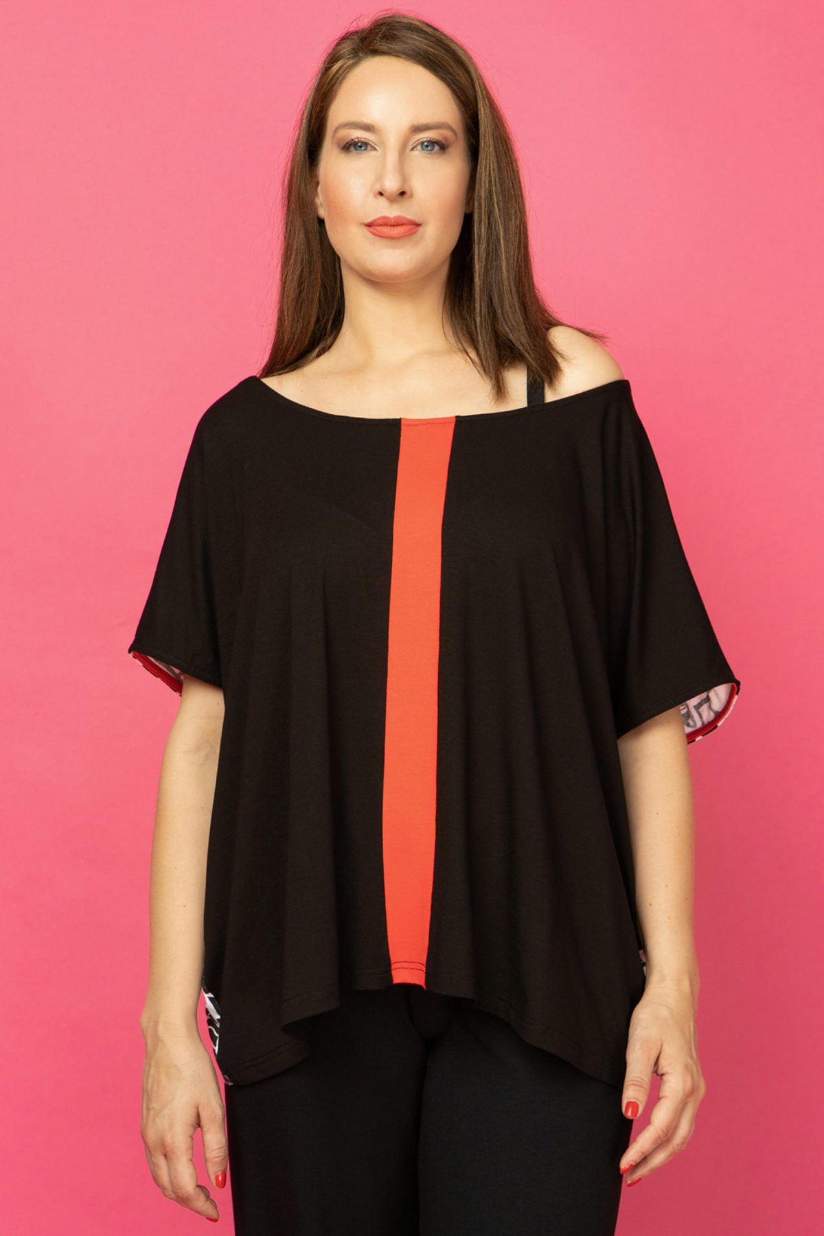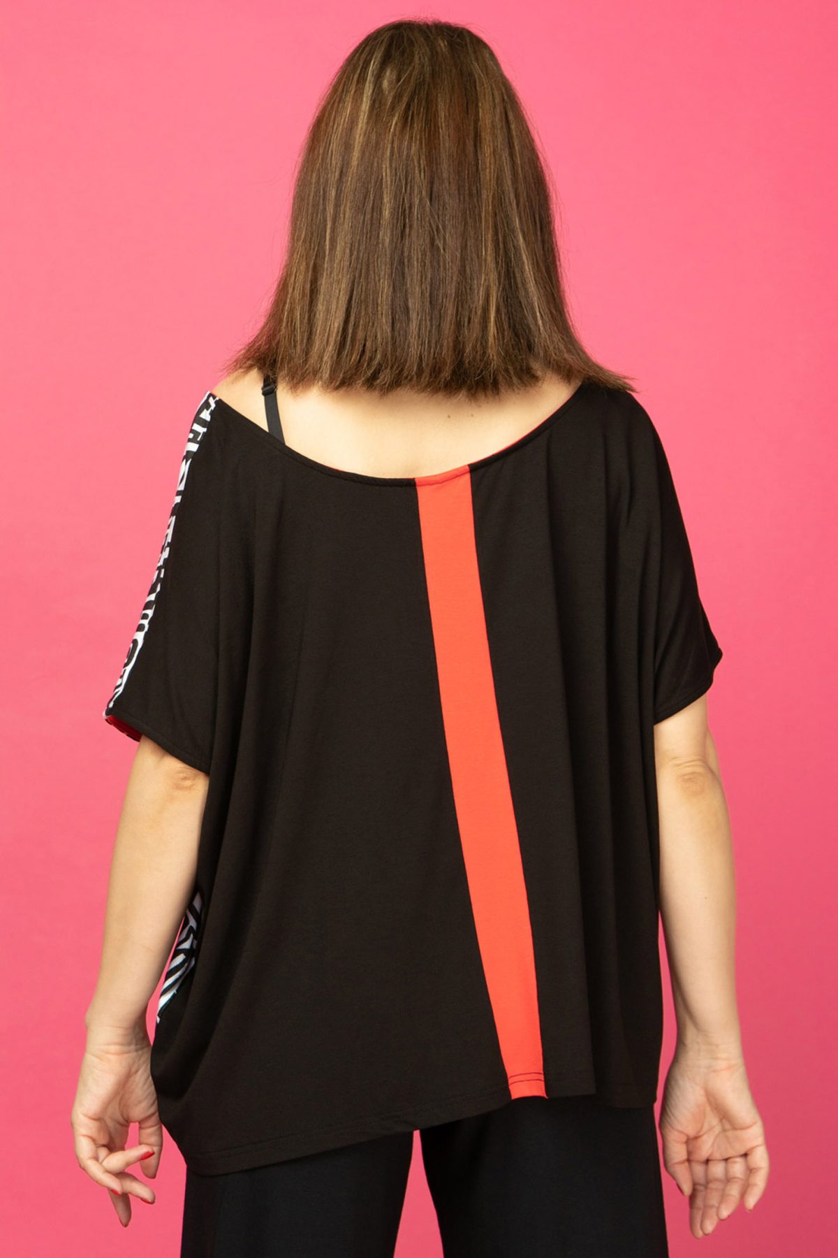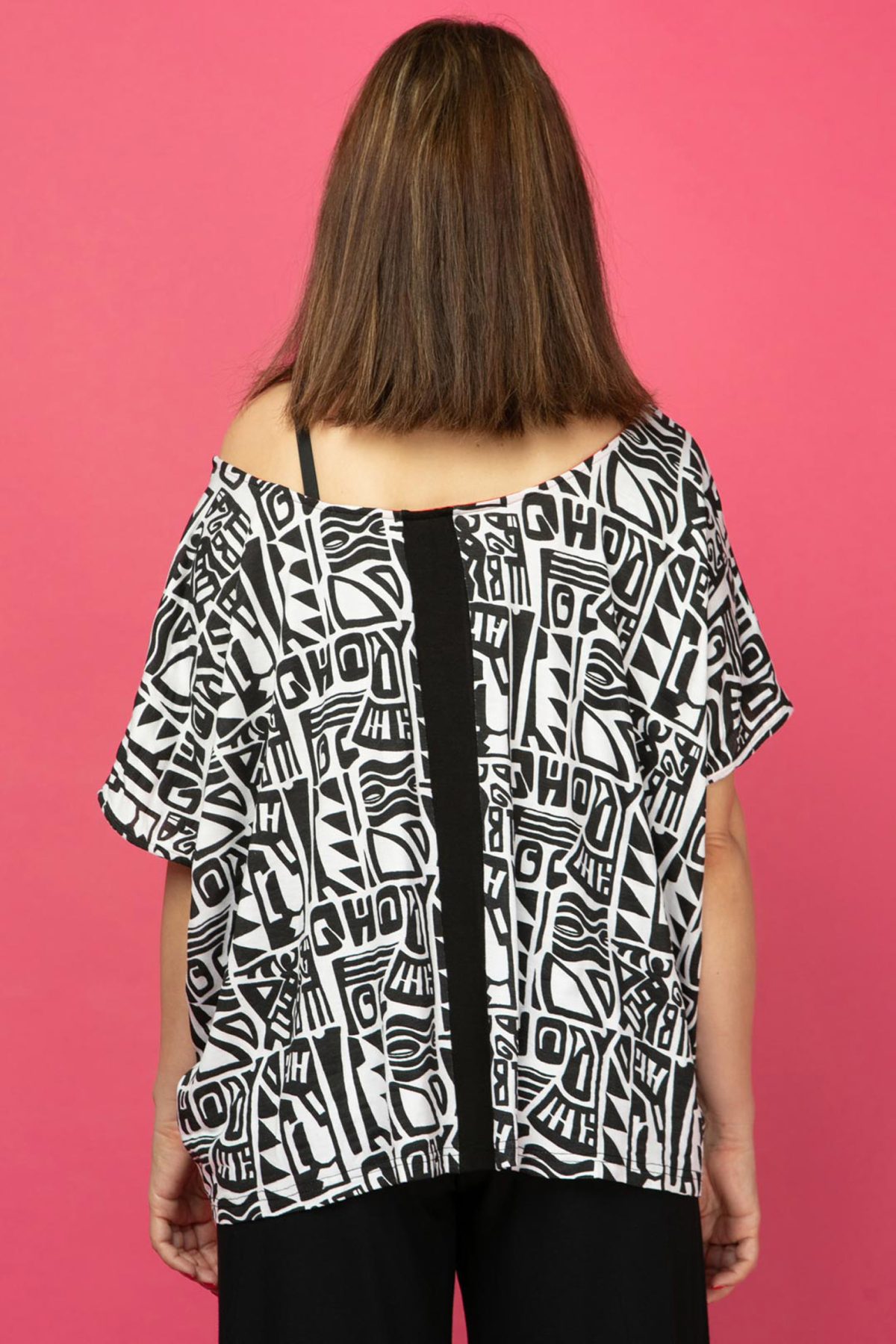 Μπλούζα ασπρόμαυρη από μπροστά και μαύρη από το πίσω μέρος με μανίκι. Η ιδιαιτερότητα της συγκεκριμένης μπλούζας έχει να κάνει με το γεγονός ότι μπορεί να φορεθεί και από τις δύο πλευρές.Μπορεί να σεταριστεί με φούστα η και παντελόνα σε διάφορα χρώματα.